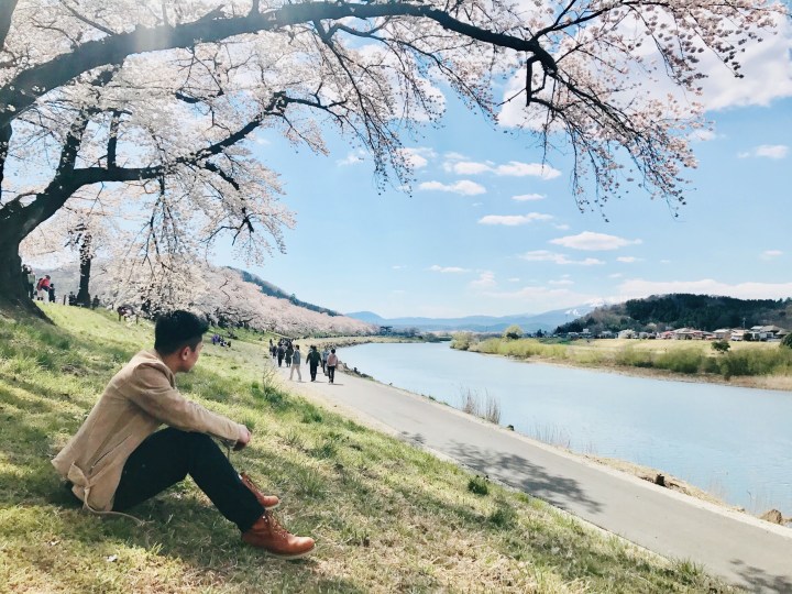 この写真は大河原の一部分の景色です。大河原は東北地方のお花見の名所で、白石川の岸に沿い約1000本の桜並木が魅力です。私が座っているところから蔵王も見えるし、川も見えるし、本当に最高の景色です。